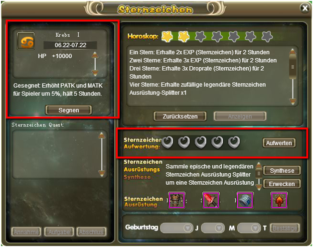 Das Sternzeichen System ist zug?nglich f?r alle Spieler ab Level 50. Du findestes unten im Panel neben der Angriffsleiste. Du musst ein Geburtsdatum eingeben, um es zu nutzen. Es hat keinen Einfluss auf das Spiel, es gibt nur das korrekte Sternzeiche f?r das Geburtsdatum an.