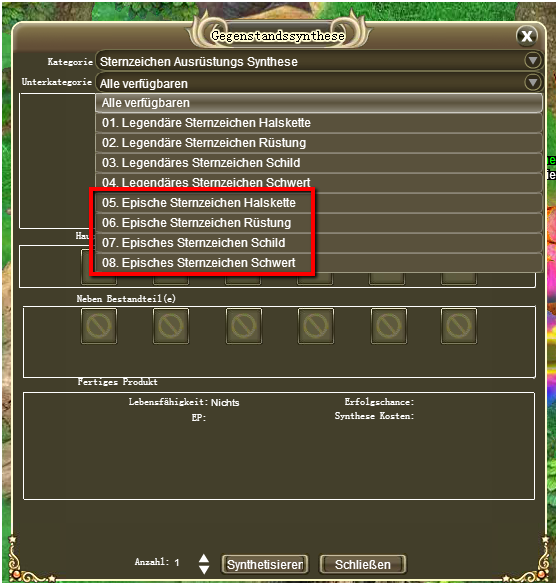 Um die Epische Ausr?stungsgegenst?nde zu synthetisieren brauchst du die entsprechenden Ausr?stungssplitter aus der Sternzeichen Quest. Gehe ins Sternzeichenmen? und klicke auf Synthese. W?hle dann die gew?nschte Ausr?stung aus.