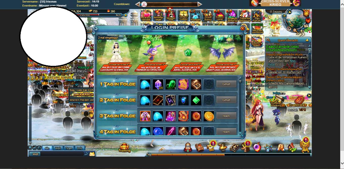 habe bei meine twink 8 tage in folge eingelogt ( diese bild vom andern twink ) und habe keine Fl?gel oder formeles kost?m oder level 6 edelstein oder bonbon f?r die in folge eingeloggten tage bekommen will wissen wieso ich das nicht bekomme den da steht es eindeutig. will dazu gerne eine antwort haben weil das kan ja nicht sein wenn da steht 2 Tage in folge einloggen formelles Outfit 3 Tage in folge einlogen BonBon 5 Tage in folge Level 6 Juwel und 7 tage in folge Succubus fl?gel