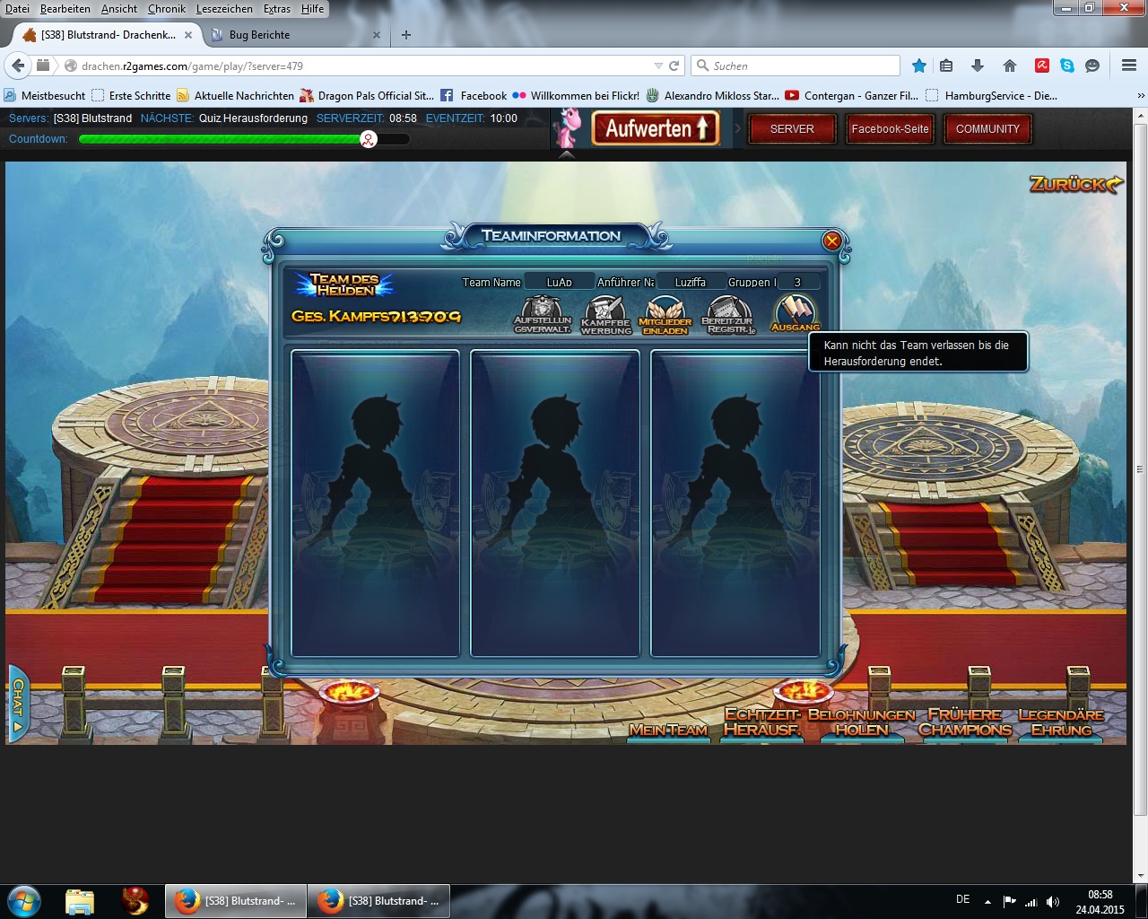 Nach etwa 5 min Ladezeit f?r "Mein Team" konnte ich als Teamleiter den Bug-Chara leider nicht aus dem Team entlassen, da unsichtbar, den anderen Chara konnte ich erfolgreich rausschmei?en, damit dieser leveln kann.