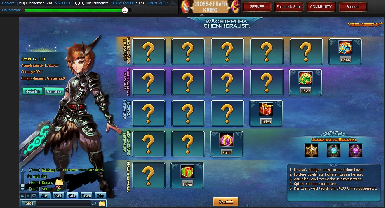 Allerdings glaube ich, dass der Drachenarena-Fehler und der Ranglistenfehler tats?chlich andere Ursachen haben, da es eigenst?ndige Men?s sind, die erst durch Klicken eines Buttons geladen werden, nicht beim Ort-Betreten und in beiden Men?s werden die Kronen nicht geladen.