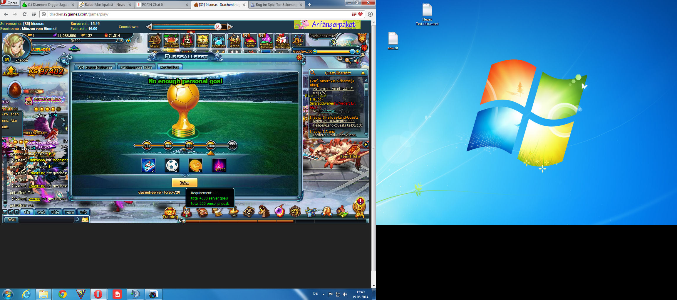 Laut meiner Rechnung hat der Tag 24 Stunden also kann man 48 mal versuchen das Tor zu treffen. Trifft man dieses 3 mal kommt man auf 144 Treffer.Wenn man die Belohnung f?r 2000,4000 und 8000 Servertore haben m?chte mu? man 150,200 und 300 eigene Tore haben.Dieses geht aber nicht weil man ja h?hstens 144 eigene Tore pro Tag schie?en kann.ABER UM 00:00 UHR WERDEN ALLE TORE AUF NULL ZUR?CK GESETZT!!!!!!!!