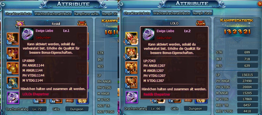 Joa wie hier unschwer zu erkennen ist haben die Ringe ein unterschiedliches Level und auch die stufen bei den Ehelevel sind unterschiedlich... nun meine frage wie kann das sein? Nach R?cksprache mit anderen gab es sachen wie Zuneigung usw bei einigen Aufladeevents bei denen sie jedeoch f?r beide Partner die preise erhalten haben(also Zuneigung usw)Stichworte: -