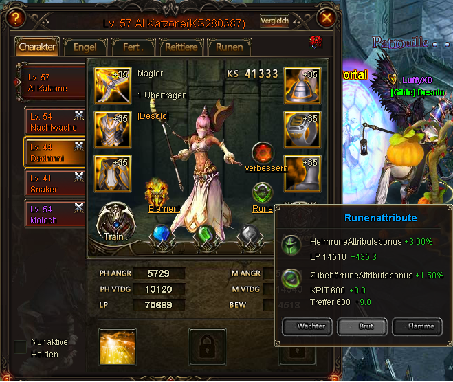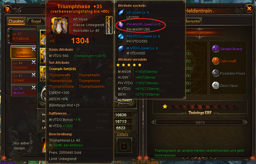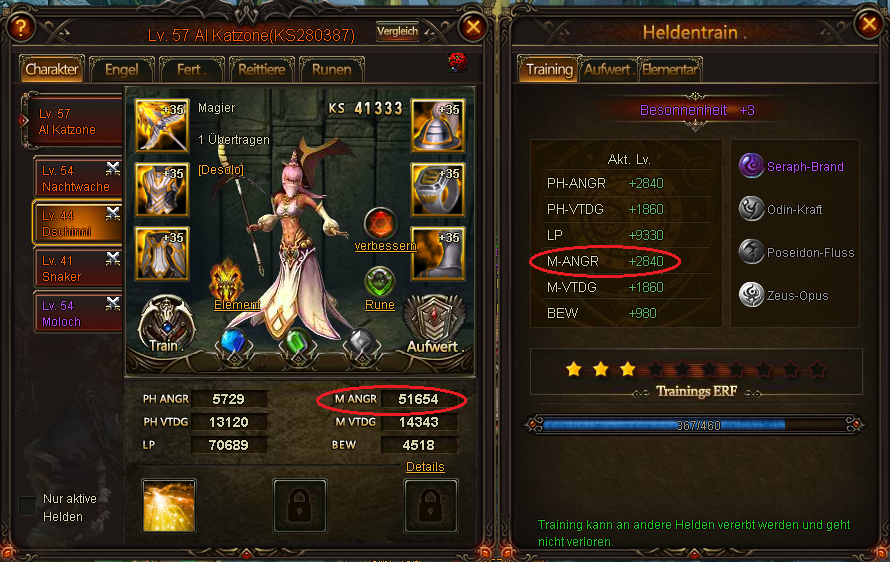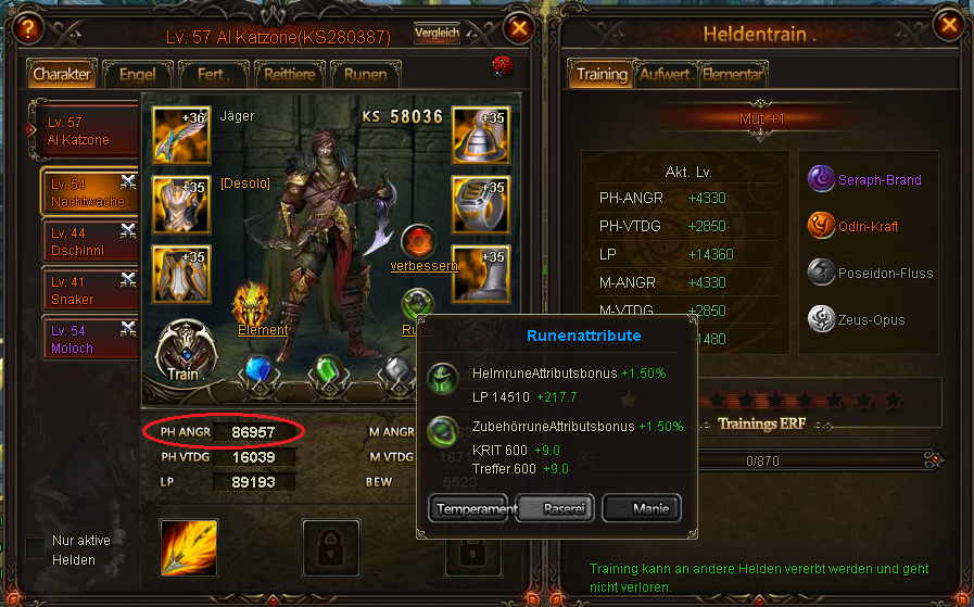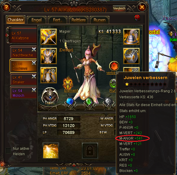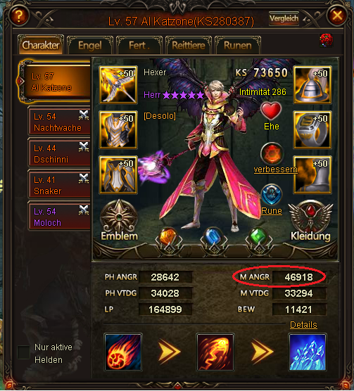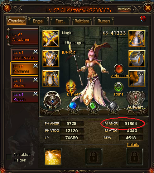 Hier noch ein Screenshot von seinem Main Char, der deutlich weniger Angriffspunkte hat, als seine anderen Helden. Dies ist sehr ungew?hnlich!