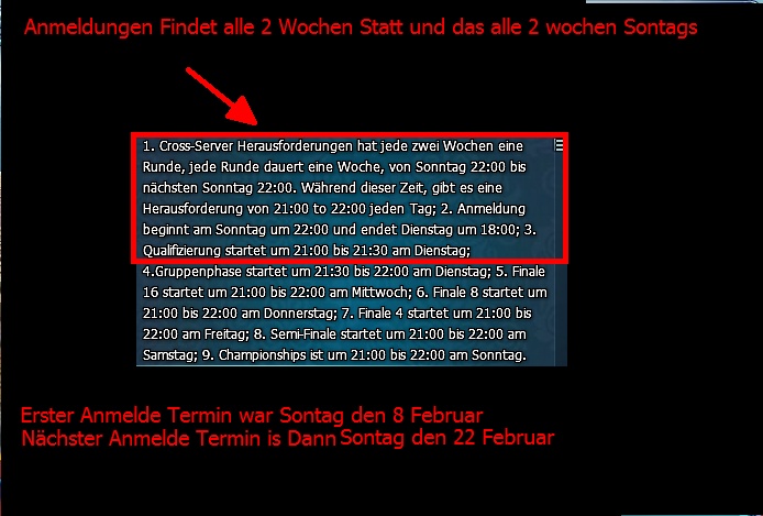 Ich habe bisher nirgends gelesen ob es eine Begrenzung f?r Anmeldungen zur Cross Server Herausforderung gibt. Jedoch, ich kann mich nicht Anmelden, angeblich steht kein Anmelde Zeitraum zur Verf?gung. Anmeldezeitraum is von Sonntag 22 - Dienstag Jedoch konnte ich mich bisher nicht anmelden.
