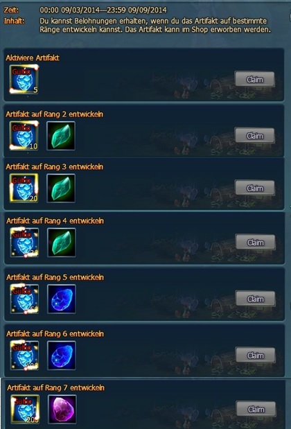 Inhalt: Du kannst Belohnungen erhalten, wenn du dass Artifakt auf bestimmte R?nge entwickeln kannst. Das Artifakt kann im Shop erworben werden.