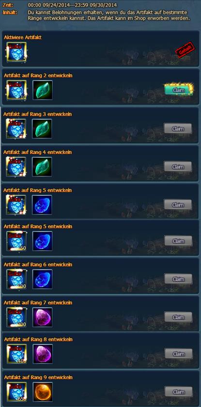 Inhalt: Du kannst Belohnungen erhalten, wenn du das Artifakt auf bestimmte R?nge entwickeln kannst. Das Artifakt kann im Shop erworben werden.