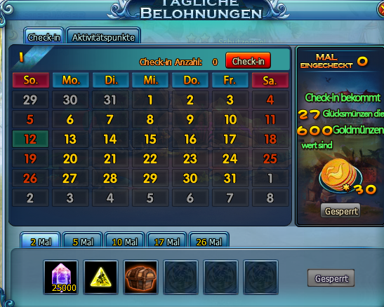 Checke jeden Tag ein und erhalte Belohnungen am 2ten, 5ten, 10ten, 17ten und 26ten Tag jeden Monat.