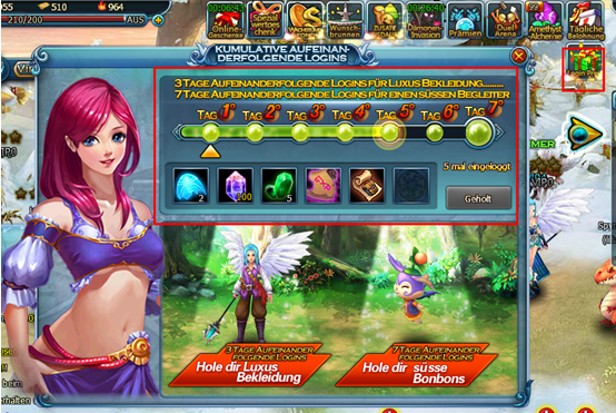 ? Logge dich 7 Tage hintereinander ein und erhalte: Bonbon-Splitter x 5, Alchemiezauber x 2, Drachenseelenzauber x 2, Diamant-Entwicklungsk. x 5, Top-ERF-Trank x 5, Trankf?higkeit x 1