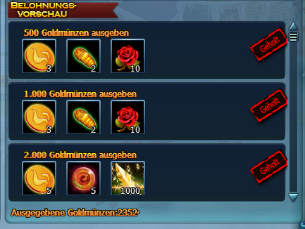 Verwende Goldm?nzen und erhalte spezielle Belohnungen. Wenn du 250 Goldm?nzen investierst, erh?ltst du alle Belohnungen.