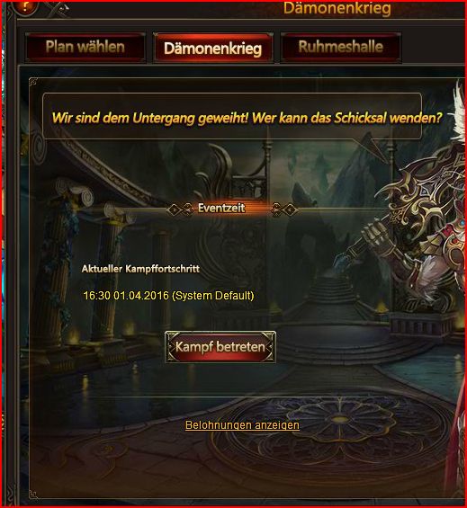 Das Sachen schief gehen war im grunde abzusehen.Bisher sinds nur die Kleinigkeiten was verschmerzbar ist.Allerdings siehts so aus als w?re D?monenkrieg auch von betroffen.Jedenfalls bei uns...Gestern stand noch Datum von heute drin mit 21 Uhr..also wie es sein sollte.Jetzt steht der 01.04.drin mit 16:30 Uhr.Rangliste ist auch nicht zur?ckgesetzt...daher wird's da wohl mit der Umstellung net geklappt haben.