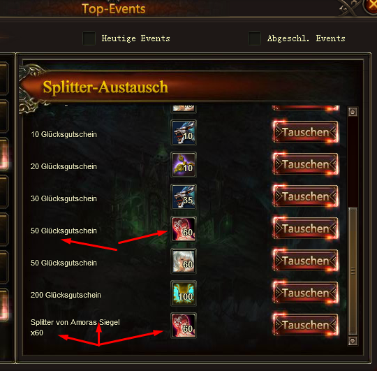Beim zweiten ist es lediglich ein Korrekturtausch und ben?tigt keine Gutscheine sondern Splitter von Amoras Siegel, diese wurden am WE f?lschlicherweise anstelle von Amorasplittern beim Event ausgegeben