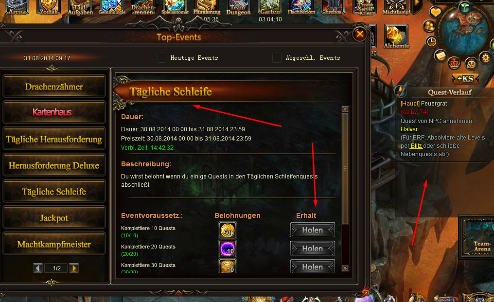Hallo ich habe das prob das ich f?r meine Schleifenquest die Belohnung bei Top events nich holen kann