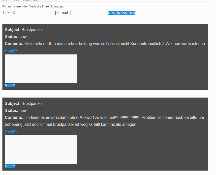 Schau Dir doch bitte mal Deine zwei Bilder und lese Dir durch was dort steht. Jetzt die Preisfrage. Was w?rdest Du auf solche Tickets antworten? ?berdenke mal Deine Wortwahl, formuliere eine Fehlerbeschreibung die den Fehler eventuell rekonstruierbar macht. Je genauer Deine Fehlerbeschreibung desto leichter kann Dir geholfen werden. Ein paar Screenshots w?ren auch sehr hilfreich. Spielername und Servernummer nicht vergessen. Das ganze postest Du dann im Bereich "Bug Berichte". Ein GM sammelt die von Euch gemeldeten Fehler mit einem Link zu Eurem Thread. Auch wenn dort niemand direkt antwortet wird die Liste abgearbeitet.