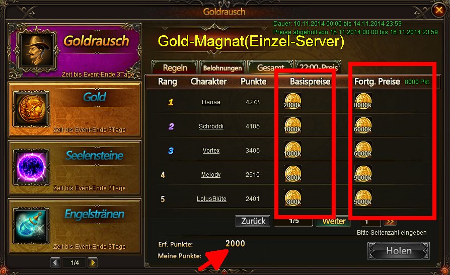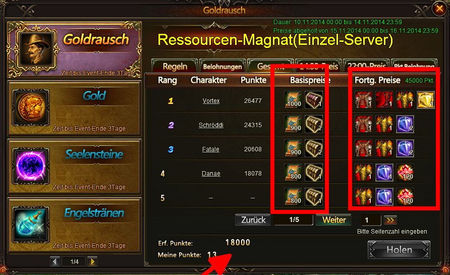 Im ersten Bild sehen wir die Hauptpreise Rot markiert. Einmal den Basispreis (Bedingung in diesem Goldrausch mindestens 18000 Punkte am Ende des Events) und den Fortg. Preis (Bedingung in diesem Goldrausch mindestens 45000 Punkte am Ende des Events). Bedingungen f?r die einzelnen Preiskategorien k?nnen von Goldrausch zu Goldrausch variieren.