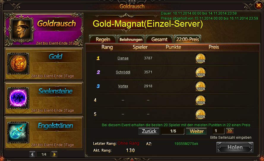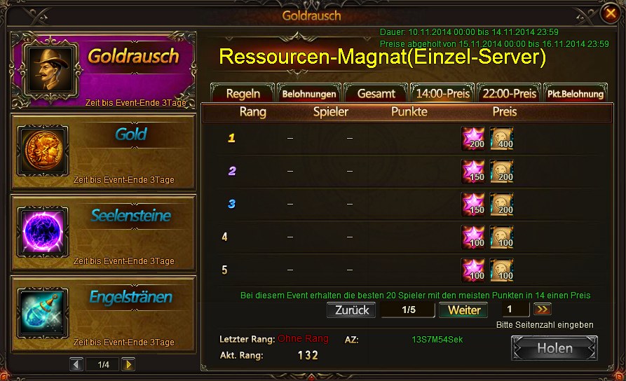 Diejenigen die die Bedingungen (in diesem Goldrausch 18000 Punkte, sichtbar in Bild 1, markiert durch den roten Pfeil) f?r die Belohnung erf?llt haben kommen ins 14:00 Ranking. Das gleiche passiert nochmal um 22:00 Uhr. Wie wir in Bild 2 und 3 sehen erhalten nur die Top 20 die jeweils ausgeschriebenen Preise. Was hier in diesem Beispiel sch?n ersichtlich ist, dass keiner um 14:00 Uhr die 18000 Punkte hatte, aber um 22:00 Uhr schon drei und der vierte lauert bereits f?r die n?chste 14:00 Uhr Belohnung. Die Zeit bis zur n?chsten Belohnung kann man auch sehr sch?n am Countdown hinter AZ in Bild 2 und Bild 3 erkennen.