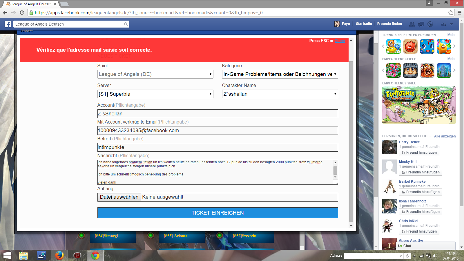 Die Mailadresse passt nicht. Geh mal nicht ?ber FB, sondern ?ber die R2 Startseite ins Spiel rein und schau da unter deinen Infos, was f?r Daten hinterlegt sind. Dann versuch es nochmal - am besten nicht ?ber FB ^^