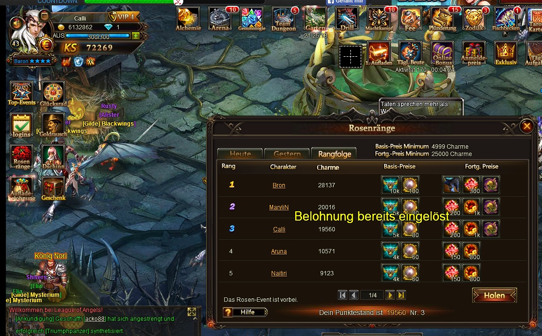 Da du nur 19560 Punkte erreicht hast, k?nntest du nur 5.000 Prestige Punkte und 80 Segnungssteine abholen.