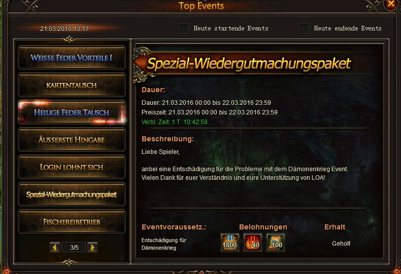 an der Anzahl der roten Kriegsherr Sch?rpen sieht man, das ich mir das Spezial-Wiedergutmachungspacket nicht geholt habe, obwohl es so bei den Top-Events angezeigt wird. Es w?re nett,
