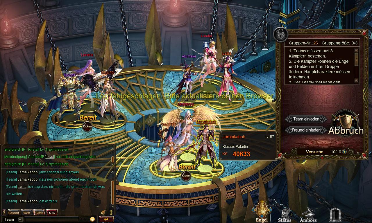 Die Team-Arena auf dem Server Luxuria funktioniert jetzt seit gestern morgen gegen 12 Uhr nicht mehr richtig. Man bekommt nach Zusammenstellen des Teams die Meldung "Logfehler - Browser aktualisieren" und fliegt zum Team-Schirm der Arena mit den 3 Leuten des Teams.