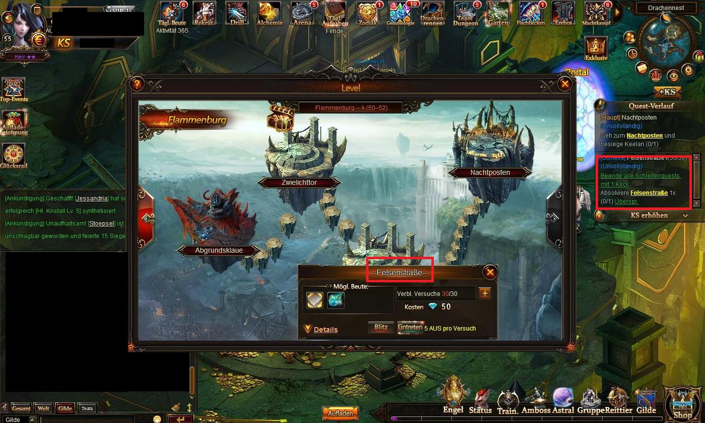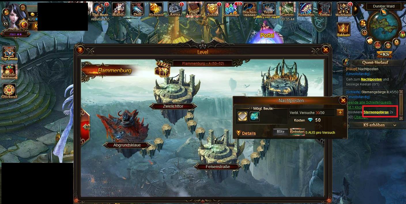 Flammenburg A ist f?r Level 50-52, dir fehlt da auch noch der letzte Dungeon namens "Betrachterstra?e".