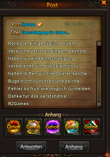 Was mich ehrlich gesagt grad ziemlich ank?st, hier kannst Tickets schreiben wegen fehlenden Belohnungen, die werden gel?scht und die Buguser bekommens frei Haus ? Sachtmal gehts eigentlich noch ? Gut ich geh?r nicht zu den hardcore Cashern, aber VIP und Kleinigkeiten waren bisher drin, das wird sich aber unter Garantie ?ndern.