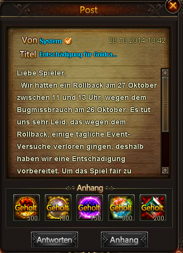 wen ich es weiss werd ich es dir mitteilen. ich find nur halt sehr ungerecht da die die nix gemacht haben somit wider nen extremen nachteil haben. den 100 seraph steine, 900k gold, 300 segnungsteine/seelen steine doch nen bissel was ausmachen. und dan waren auch ca 30 tr?nen mit bei sowie staub glaub auch um die 300. also schon extrem mehr und wertvoller als die entsch?digung ausm top event