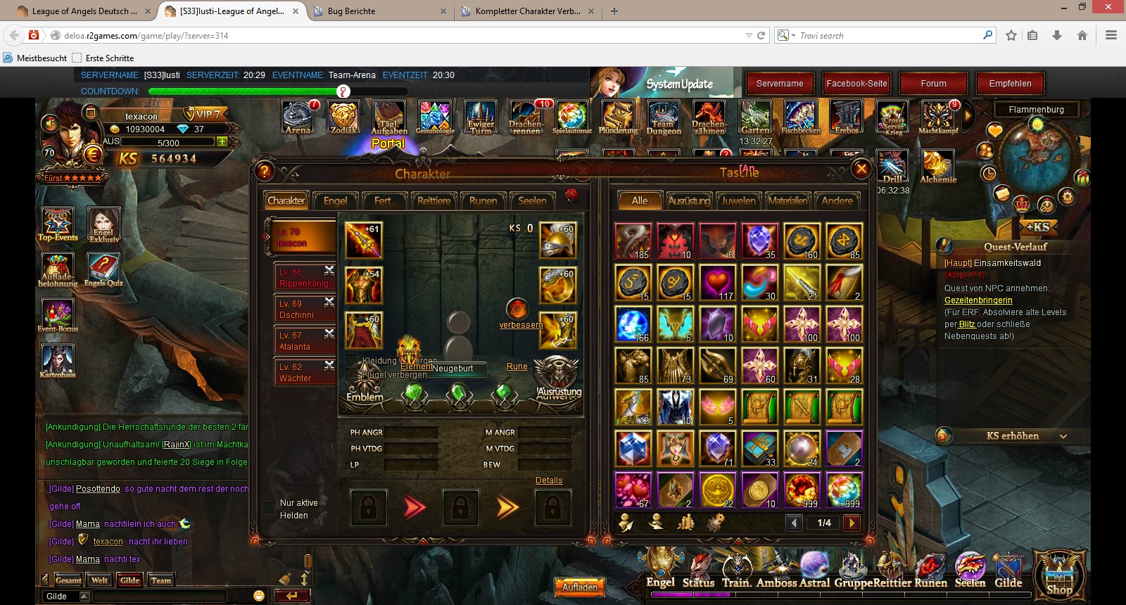 also ich hab noch ne erg?nzung, immernoch s47 acc shigure. legt blo? nich bei euren nebenchars die ausr?stung ab oder wertet sie auf, neu anlegen geht nicht. ich renn nun mit ner halbnackten dschinni rum, was sehr schade ist, da ich wb, fehde, mk, arena usw. dadurch massiv abfallen werde und war da eigentlich immer top10. auch neue helden rekrutieren wird sinnlos werden wenn ich an der ausr?stung, heldentraining, elementar, aufwertung und juwelengravur nichts machen kann. ich w?rd ja auch gerne aufladen, aber mit ner halbnackten dschinni lvl 60 (2mal neugeboren) recht sinnlos, vorallem wenn ich nicht wei?, wann es gefixt wird und ich renn schon ?ber ne woche mit dem bug rum (siehe seite 2), aber 5. wb, mk usw. werde ich jetzt definitiv nicht mehr halten k?nnen. hoffe auf sehr schnelle behebung, dankesch?n.