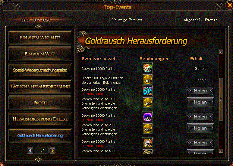 ich hab mal wieder einen Bug beim Goldrausch und zwar habe ich die 20000 Gemo Punkte die ben?tigt werden f?r die Belohnung in der Goldrausch Herausforderung deutlich ?berschritten leider l?uft der Z?hler in den event bei mir nicht mehr mit der ist einfach bbei 17000 und ein paar zerquetschten punkten stehen geblieben. siehe die eingef?gten Screens.