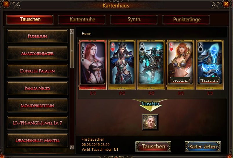 - Du kannst die ben?tigten Karten gegen folgendes tauschen: Poseidons Symbol, Mondpriesterin-Wappen, Amazonenj?ger-Wappen, Dunkler Paladin-Wappen, Panda Nicky-Wappen, LP-/PHANGR-Juwel Lv.7, Drachenblut-Mantel und vieles mehr.