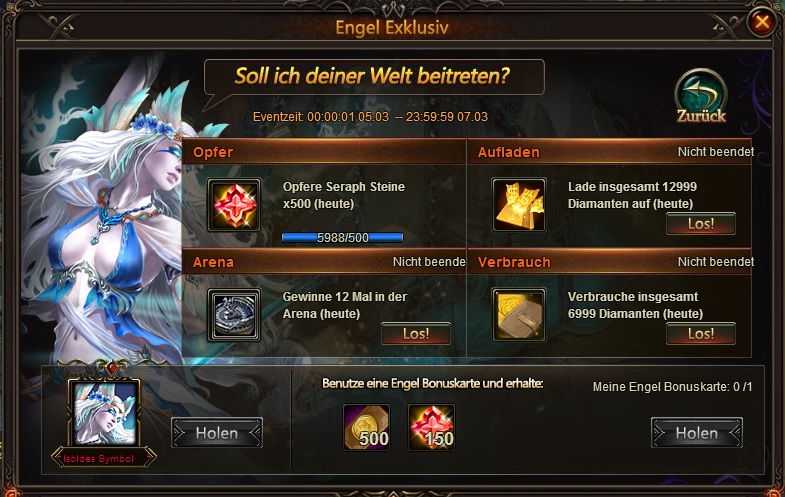 Beschreibung: Mach dich bereit und nimm deinen Lieblingsengel mit in den Kampf! In dem neuen Event Engel Exklusiv warten 3 Engel Aoede, Styx und Isolde auf dich. Welchen Engel wirst du w?hlen, um deiner Welt beizutreten? W?hle einen Engel und erf?lle alle Anforderungen, um sie in dein Team zu rekrutieren!