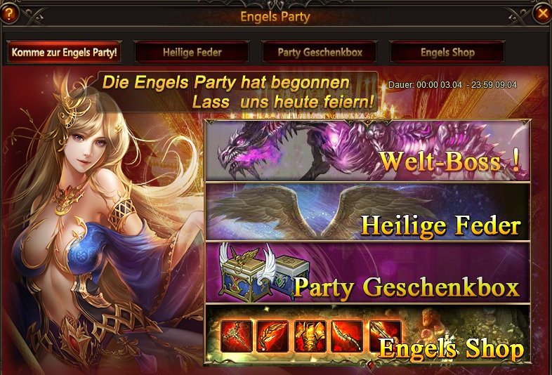 Beschreibung: Klicke auf das Engels Party Icon oder besuche Varda um die Party Events zu sehen: Welt Boss, Heilige Feder, Party Geschenkboxen und der Engels Shop.