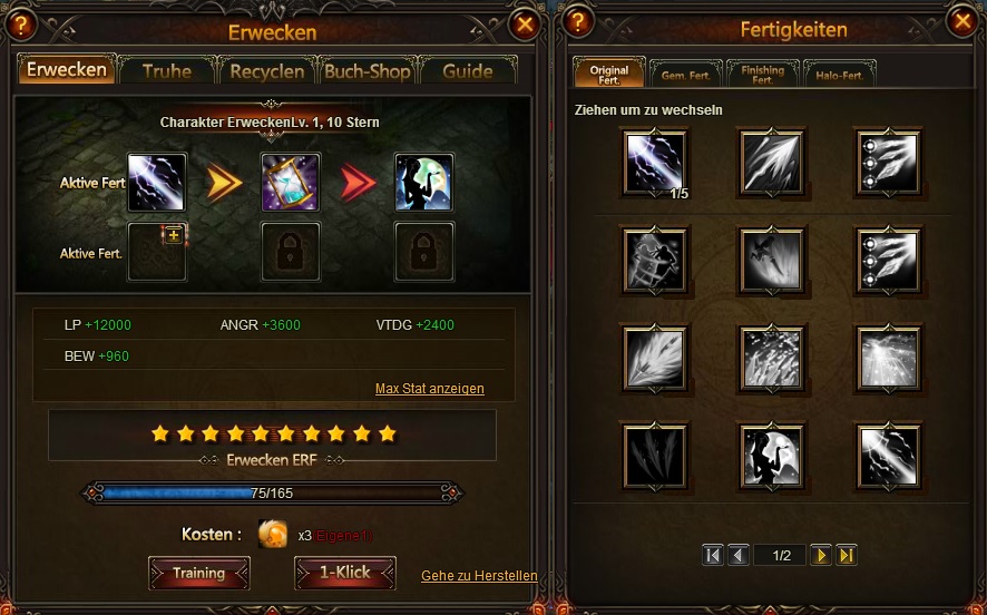 - ? Dieses System erm?glicht es dir, deinen Charakter in vielen F?higkeiten zu trainieren. Die verwendeten Materialien in diesem System sind Erwecken-Steine, Seltene G?ttliche Steine, Erwecken Fertigkeit Auslosen.