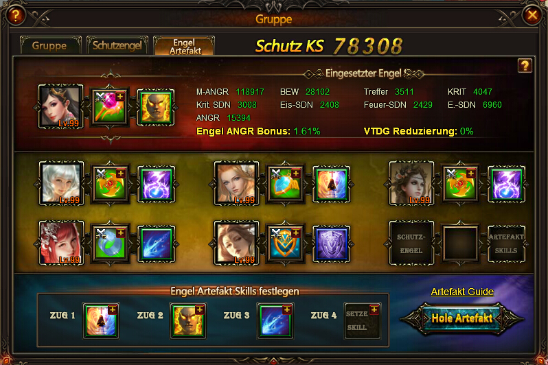 Du musst ein Artefakt pro Engel im Schutzengel System und ein Artefakt in ?Eingesetzter Engel? ausr?sten.