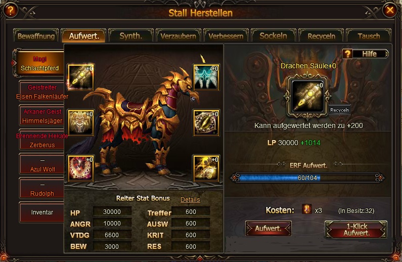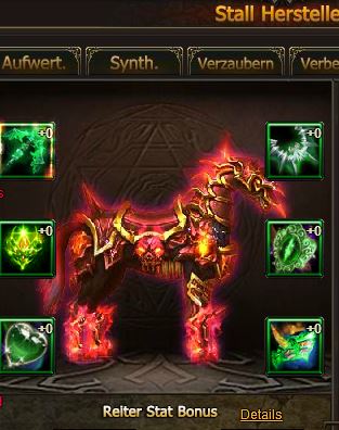 Stall Herstellen freigeschaltet ab Lvl. 74. In dieser neuen Funktion gibt es sechs M?glichkeiten, deine Reittiere auszustatten. "Bewaffnung", "Aufwert.", "Synth.", "Verzaubern", "Verbessern" und "Sockeln".