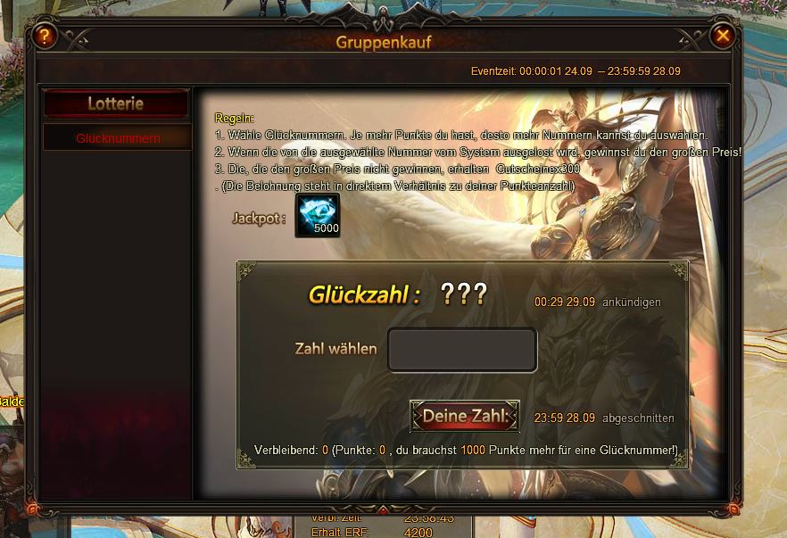 Jeden Tag, wenn ein Spieler einen Gegenstand im Gruppenkauf kauft, dann erhalten die Spieler f?r jeden Gegenstand, eine Chance in der Verlosung. Preise beinhalten Gruppenkaufpunkte und Gutscheine. Es gibt sogar ein Gegenstand der 100% des bezahlten Preis wieder zur?ckgibt.