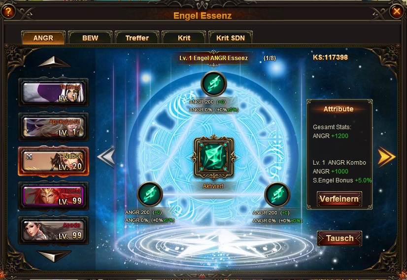 2. Kombo Stats aktivieren, nachdem eine Kombo Essenz in der Mitte und ein volles Set von normalen Engel Essenzen gesockelt sind.