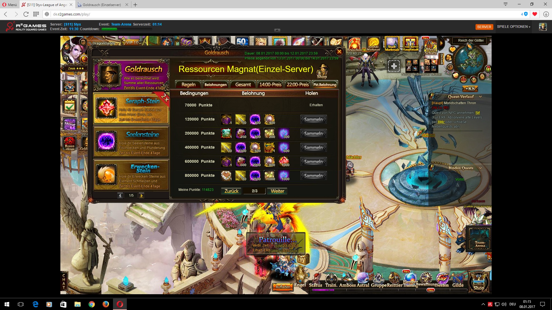Klicke auf den Goldrausch Icon auf der linken Seite des Bildschirms um Goldrausch zu ?ffnen. Spieler erhalten Punkte wenn sie die erforderlichen Ressourcen w?hrend dem Event einsammeln, wie z.B. Gold, Runensteine, Seelensteine, Segnungssteine, Seraph Steine, Elementarstaub, Engelstr?nen und ?gissplitter. Jeden Tag um 22:00 Uhr werden die mit den meisten Punkten ermittelt und Preise entsprechend vergeben. Preise beinhalten ?gissplitter, Synth. Schriftrollen, Seelensteine und Segnungssteine. Am Ende des Events erwartet die Gewinner ein sensationeller Gesamtpreis.