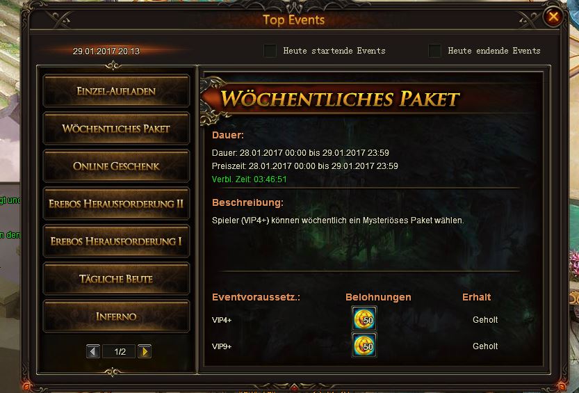 Desmodus, du hast den Post mit dem Teeren und Federn in dem Thread f?r Fl?chtige Schlachtfelder gepostet nicht hier*g* Nur so als kleine Info am Rande. Da ist er vollst?ndig vorhanden. Ja es ist wieder einmal ?rgerlich das die Items wie des ?fteren nun nicht mit dem Laufenden Event ?bereinstimmen. Allerdings war auch bei mir die W?chentliche Belohnung Kapseln und keine Tr?nen. Ab und an hilf doch richtiges Hinschauen mal