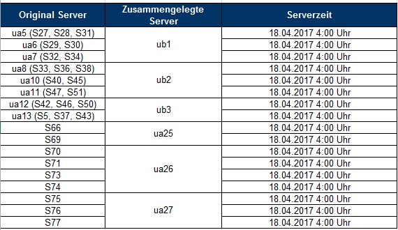 F?r ein besseres Spielerlebnis haben wir eine Zusammenlegung einiger Server in Betracht gezogen. Basierend auf euren Ideen und den Server Daten, haben wir uns f?r eine Zusammenlegung folgender, unten angef?hrter Server, am 18. April um 4:00 Uhr (Serverzeit) entschieden. Die Server werden f?r etwa 2 Stunden offline sein.