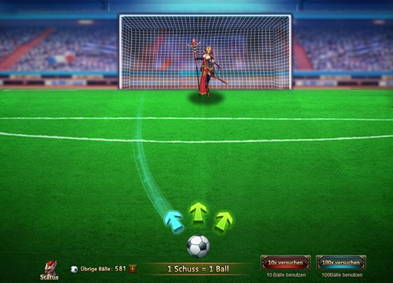 1) Klicke den Pfeil, um den Ball zu schie?en. Ein Tor beschert dir 3 Punkte, kein Tor beschert dir 1 Punkte. Jeder Schuss verbraucht einen Fu?ball. Du kannst mehr B?lle im Tor und in den Hot Events finden.
