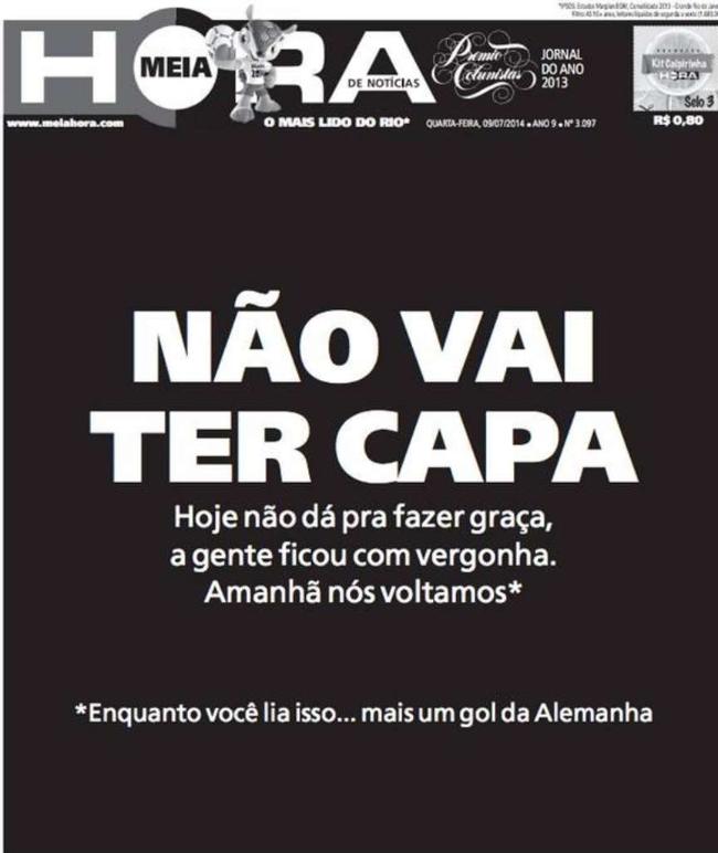 *Die Zeitung Meia Hora verzichtet gar auf eine Titel-Seite! Sie schreibt auf der ersten Seite.: ?Es gibt keine Titelseite heute. Wir k?nnen heute nicht lustig sein, wir sch?men uns. Wir kommen morgen wieder.? Besonders bitter der Sternchen-Text darunter: ?*und w?hrend ihr das lest, hat Deutschland noch ein Tor geschossen.? * (Quelle: Bild online)