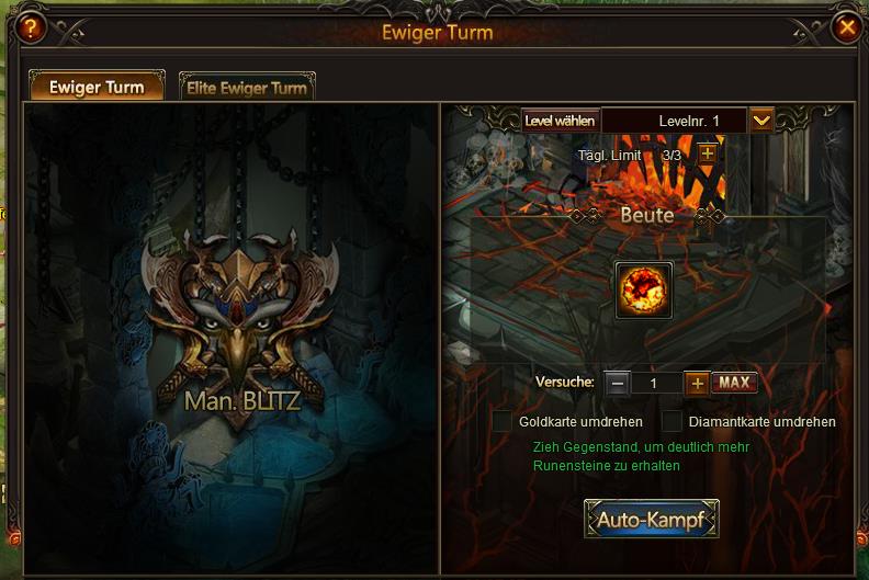 Die neue Funktion Ewiger Turm und Runensystem ist ab Lv. 50 aktiviert. Besiege auf jeder Stufe den Turmw?chter und steige auf diese Weise so hoch wie m?glich auf. Als Belohnung erh?ltst du Runensteine, welche du im Runenshop f?r h?herwertige Runensteine austauschen kannst. Benutze die Steine im Charaktermen?, um Runenskills zu aktivieren und so deine KS und Angriffskraft erheblich zu steigern.