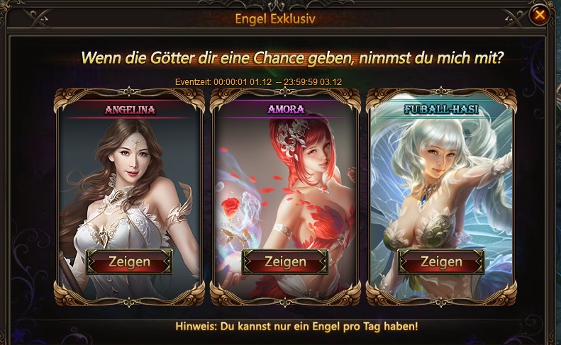 Das Engel Exklusiv Event erlaubt dir deinen Lieblings-Engel von den drei wundervollen angebotenen Engel zu w?hlen, wenn du alle ihre Aufgaben erf?llst. Wenn du einen Engel vom Engel Exklusiv Event erh?ltst, kannst du Engel Bonuskarten benutzen um noch mehr Belohnungen zu erhalten!