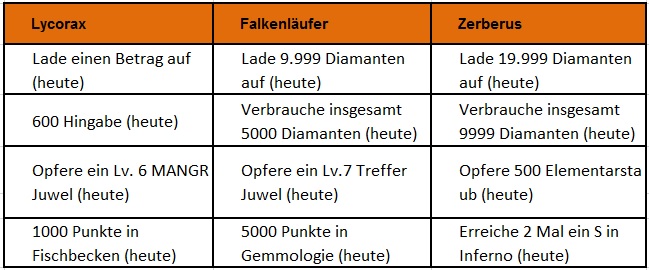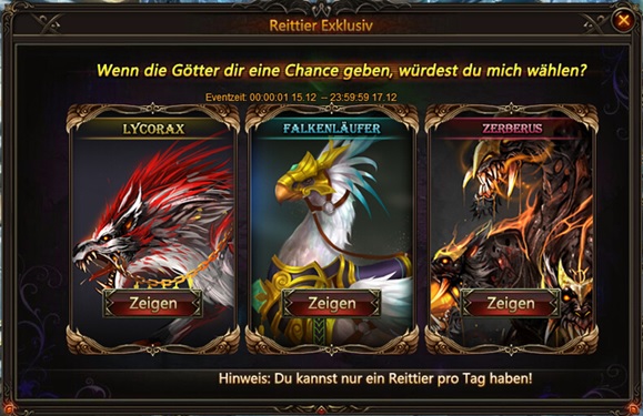 Beschreibung: Hol dir dein Lieblings-Reittier! Reittier Exklusiv, gibt dir die Chance eines dieser Reittiere mit Heim zu nehmen: Lycorax, Falkenl?ufer und Zerberus. Welches Reittier m?chtest du in deiner Welt haben? W?hle ein Reittier und erf?lle alle Aufgaben, damit es deinem Team beitreten kann! Spieler kann ein Reittier pro Tag in Reittier Exklusiv holen und Reittier Bonuskare benutzen, um diese gegen Extra-Belohnungen einzutauschen. Gib Acht und w?hle nicht ein Reittier, dass du bereits schon besitzt.