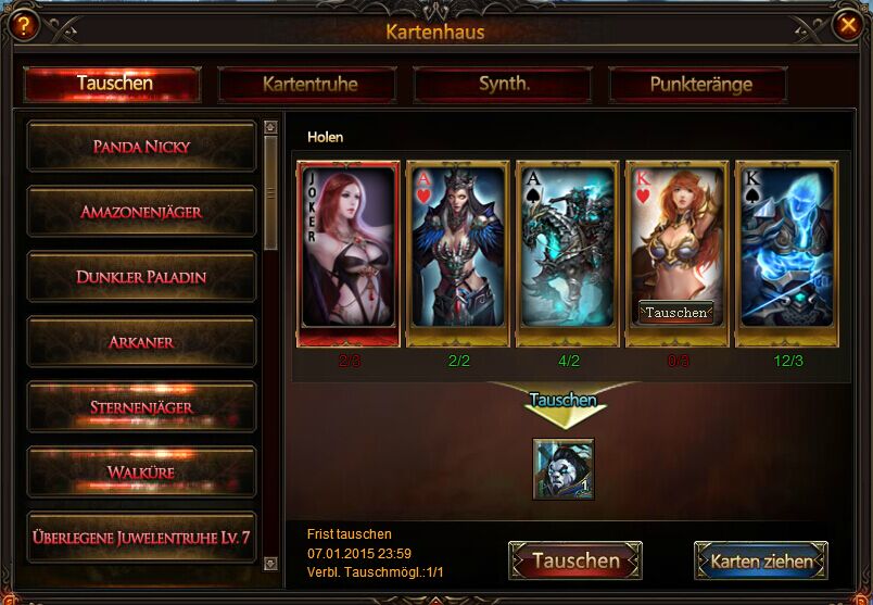 - Du kannst die ben?tigten Karten gegen folgendes tauschen: Amazonenj?ger-Wappen, Dunkler Paladin-Wappen, Arkaner Geist-Wappen, Sternenj?ger-Wappen, Walk?re-Wappen, Lv. 7 LP-/PH-ANGR-Juwel, Feuergewand, Lodernde Fl?gel, Surfer Profi, ?berlegende Juwelentruhe Lv.7/6, Zaubererz, Seraph-Stein, Segnungsstein Lv. 1, Juwelen Essenz, Topas-Heldenseele, Veredelungsstein und Synth.-Schriftrolle.