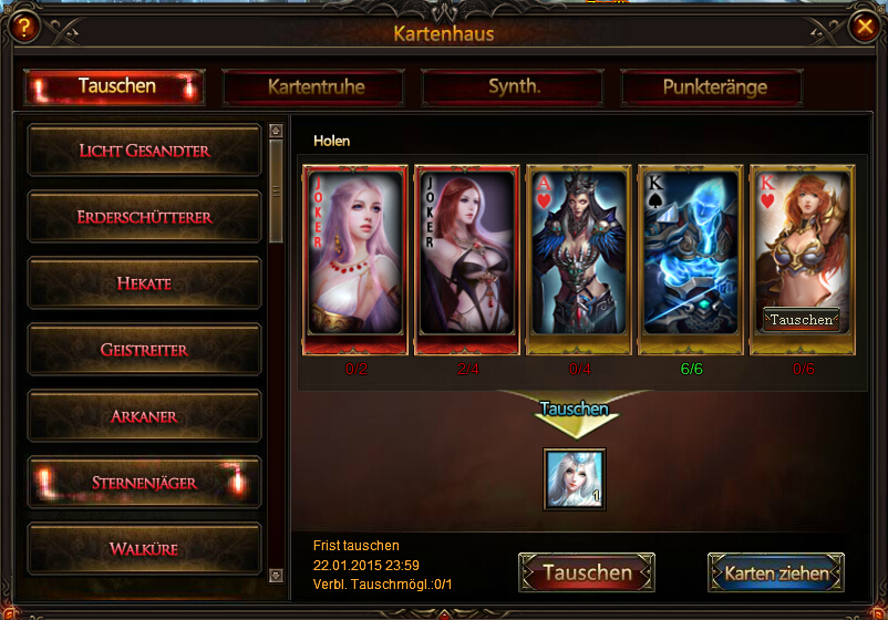 - Du kannst die ben?tigten Karten gegen folgendes tauschen: Licht Gesandter-Wappen, Erdersch?tterer-Wappen, Arkaner Geist-Wappen, Hekate-Wappen, Walk?re-Wappen, Sternenj?ger-Wappen, Shivers, Rusty und vieles mehr.