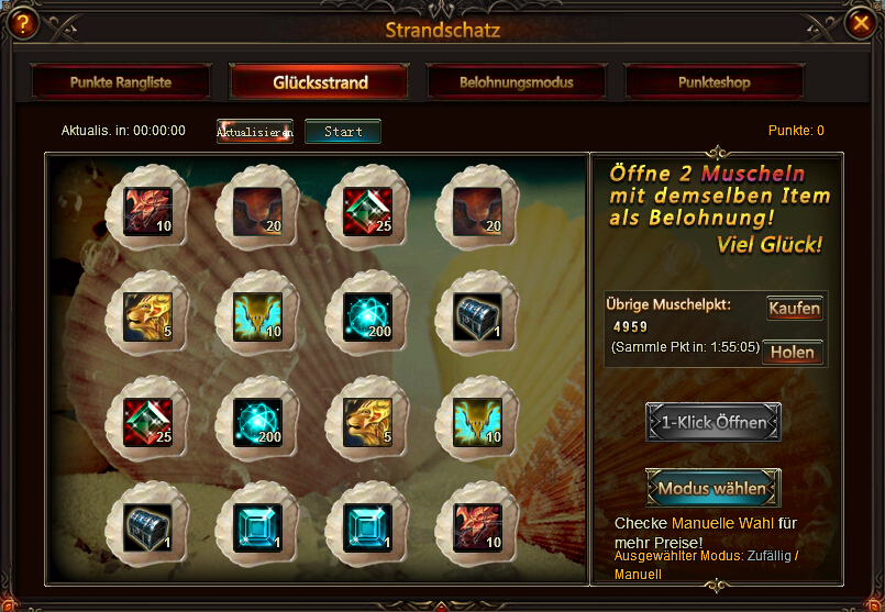 Es gibt zwei Belohnungsmodi f?r Strandschatz: Zuf?llige Wahl und Manuelle Wahl.