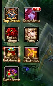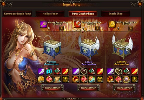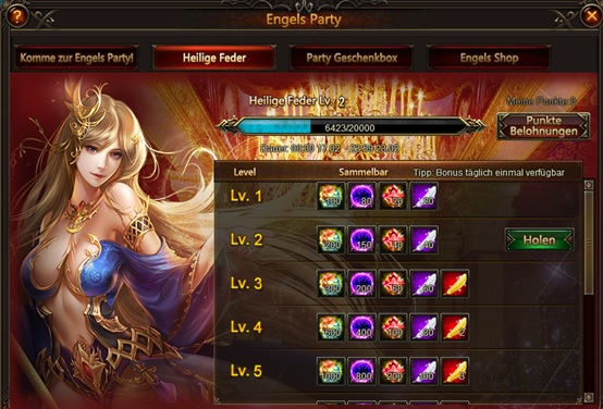 Beschreibung: Klicke auf das Engels Party Icon oder besuche Varda um die Party Events zu sehen: Welt Boss, Heilige Feder, Party Geschenkboxen und der Engels Shop.
