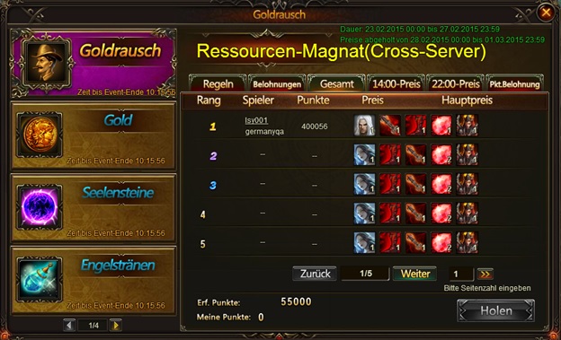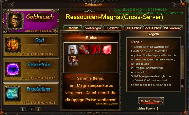 Klicke auf den Goldrausch Icon auf der linken Seite des Bildschirms um Goldrausch zu ?ffnen. Spieler erhalten Punkte wenn sie die erforderlichen Ressourcen w?hrend dem Event einsammeln, wie z.B. Gold, Runensteine, Seelensteine, Segnungssteine, Seraph Steine, Element Kristalle, Engelstr?nen und ?gissplitter. Jeden Tag um 22:00 Uhr werden die mit den meisten Punkten ermittelt und Preise entsprechend vergeben. Preise beinhalten ?gissplitter, Synth. Schriftrollen, Seelensteine und Segnungssteine. Am Ende des Events erwartet die Gewinner ein sensationeller Gesamtpreis.